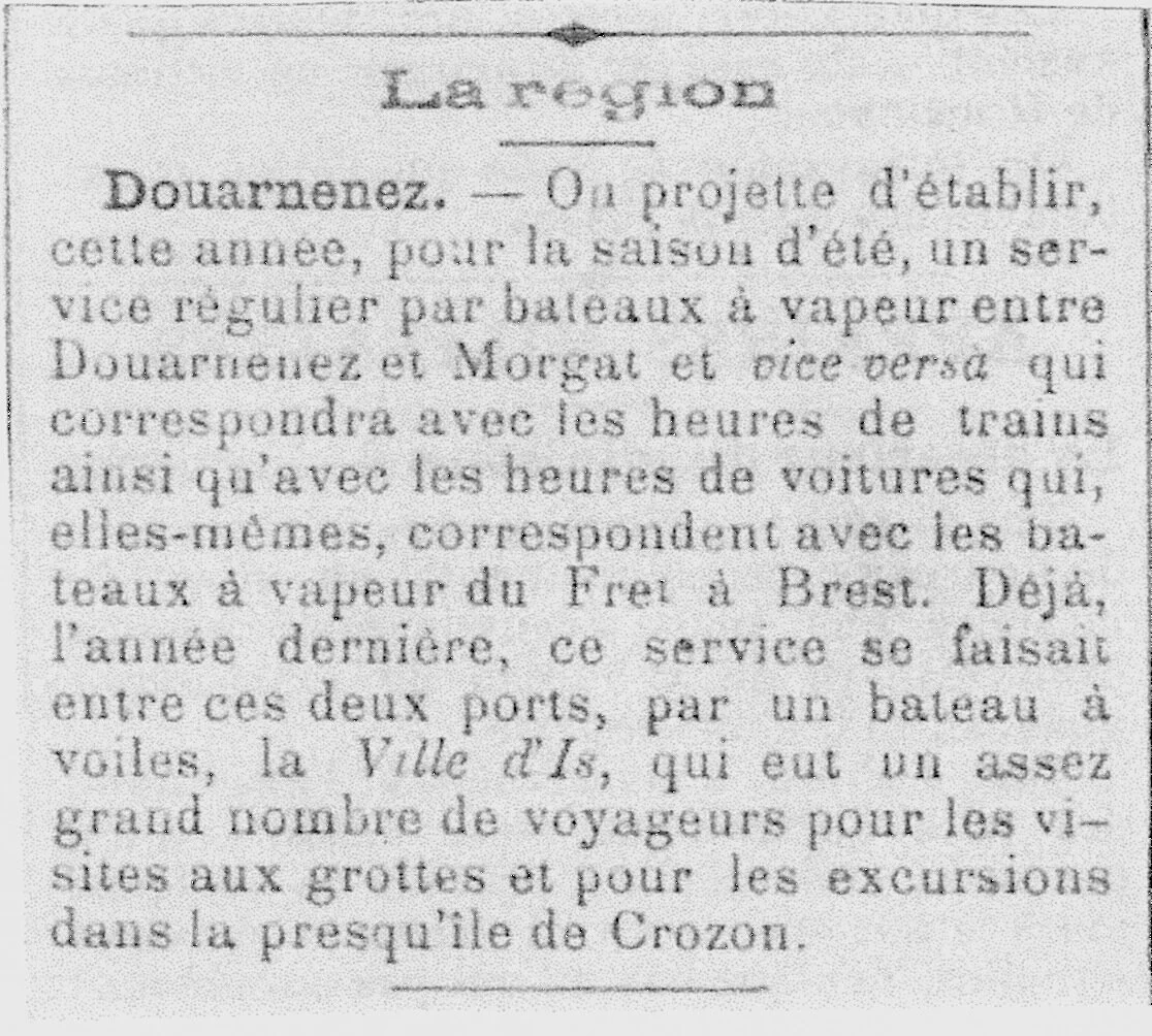 En 1887 il fut remplacé par un bateau à vapeur de la compagnie « Les Vapeurs Brestois » qui assurait la correspondance avec la ligne Le Fret – Brest du même armement. Il continua jusqu’à une date inconnue à faire des promenades en Baie de Douarnenez pour des touristes.